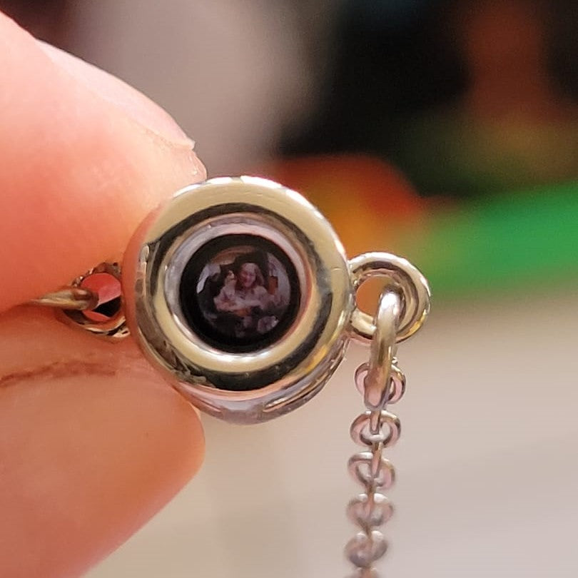 Our team converts your picture into a microscopic projection image and sets it inside the bracelet bead. The photo is sealed under clear glass and protected by durable stainless steel so it won’t fade over time.